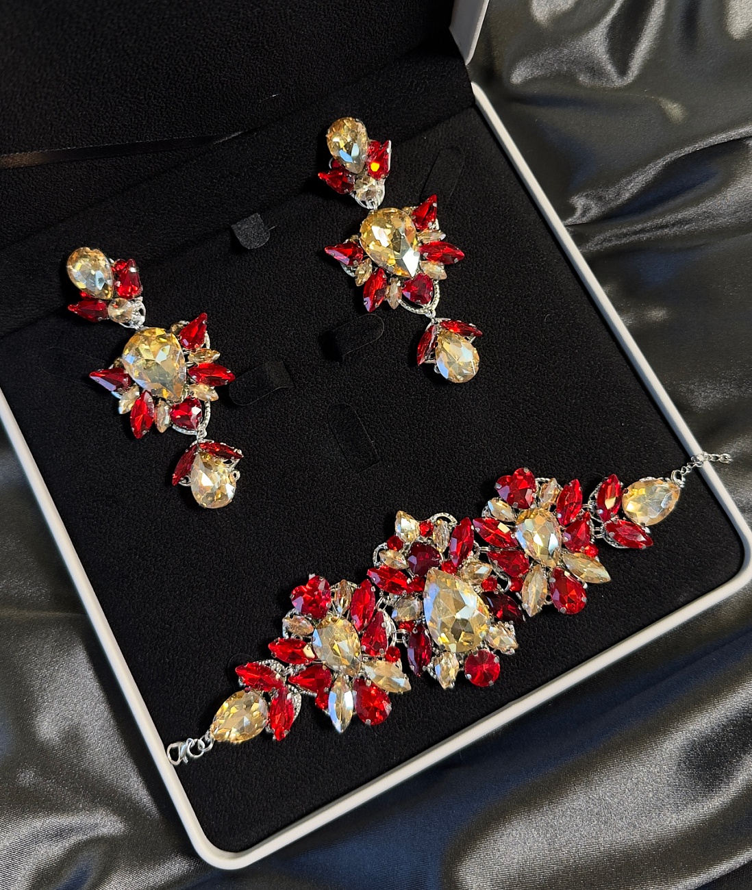 We sew the base using proven stretch fabrics — Italian velvet and approve the fit with you. Then the decoration begins: we use only reliable crystal-setting methods, hand-sewing large stones.