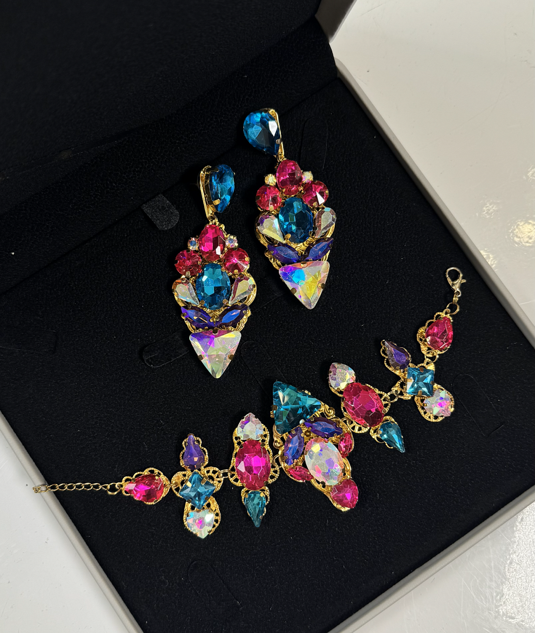 We sew the base using proven stretch fabrics — Italian velvet and approve the fit with you. Then the decoration begins: we use only reliable crystal-setting methods, hand-sewing large stones.