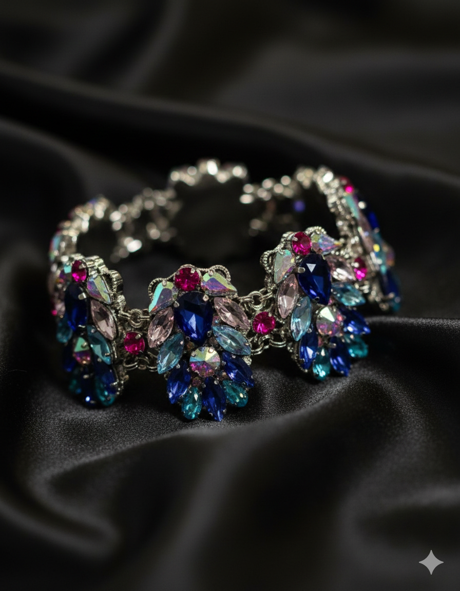 Original crystals and hand encrustation — large stones are always sewn by hand.