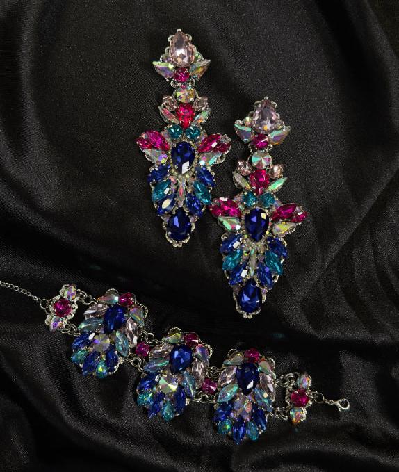 We sew the base using proven stretch fabrics — Italian velvet and approve the fit with you. Then the decoration begins: we use only reliable crystal-setting methods, hand-sewing large stones.
