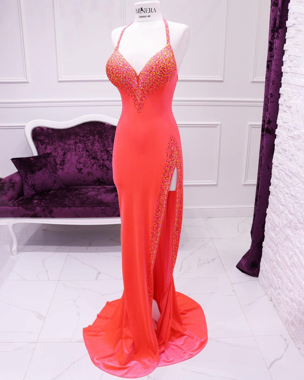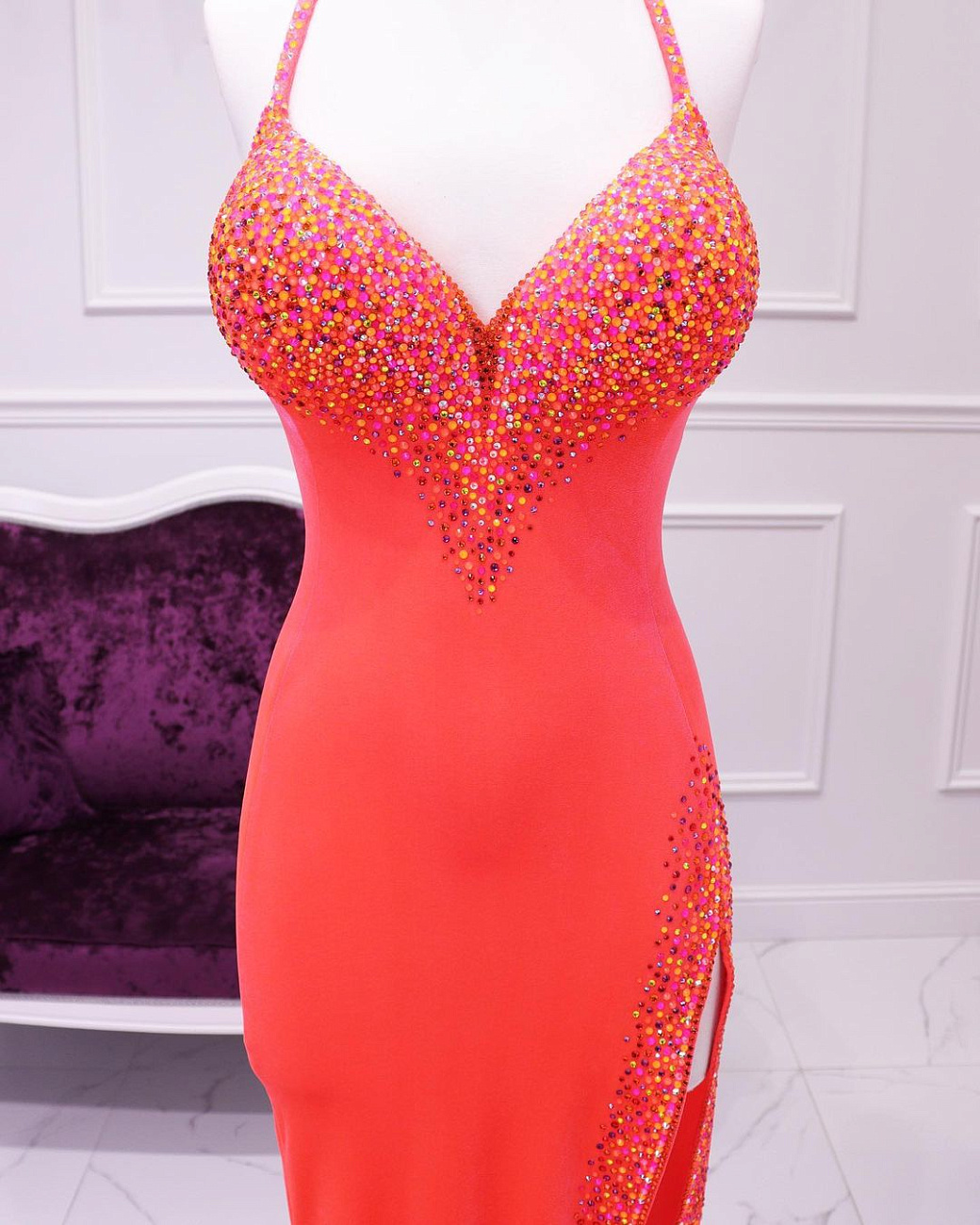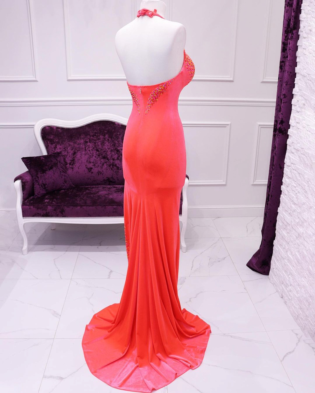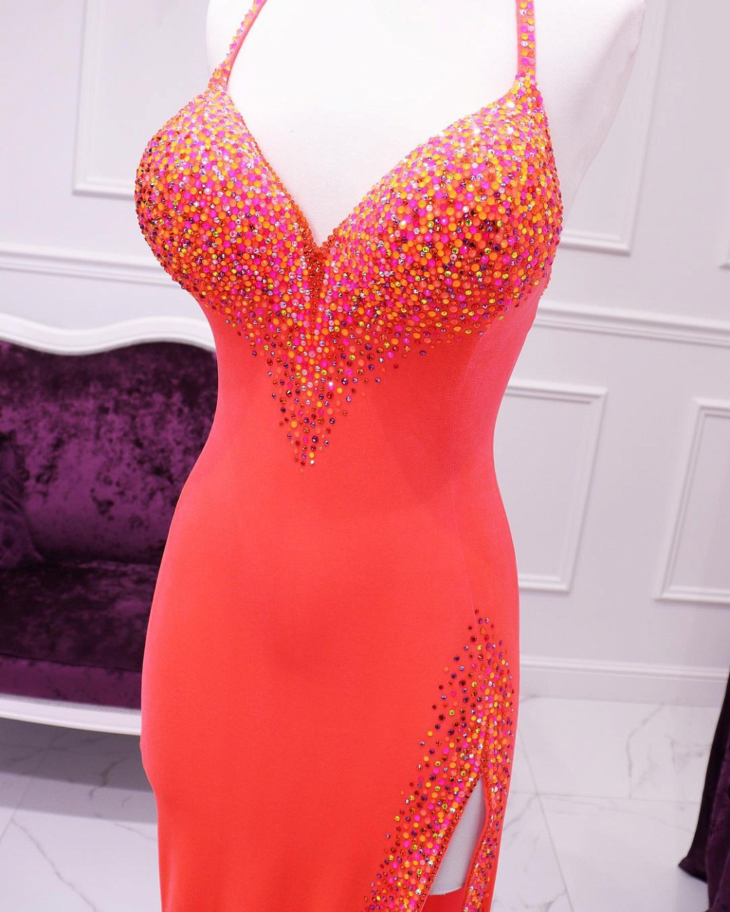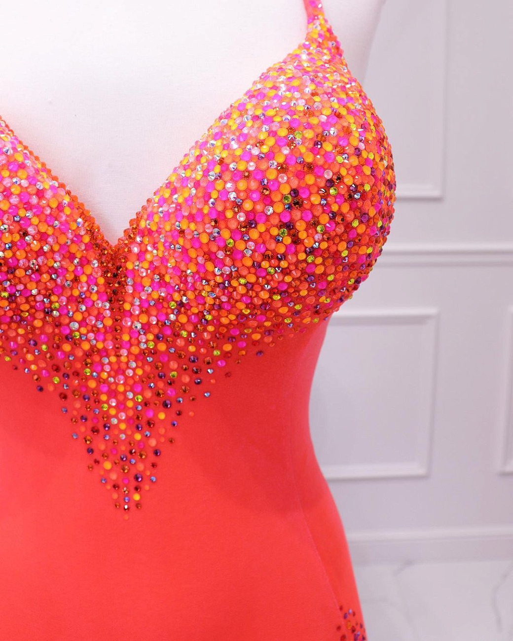 We sew the base using proven stretch fabrics — Italian velvet and approve the fit with you. Then the decoration begins: we use only reliable crystal-setting methods, hand-sewing large stones.