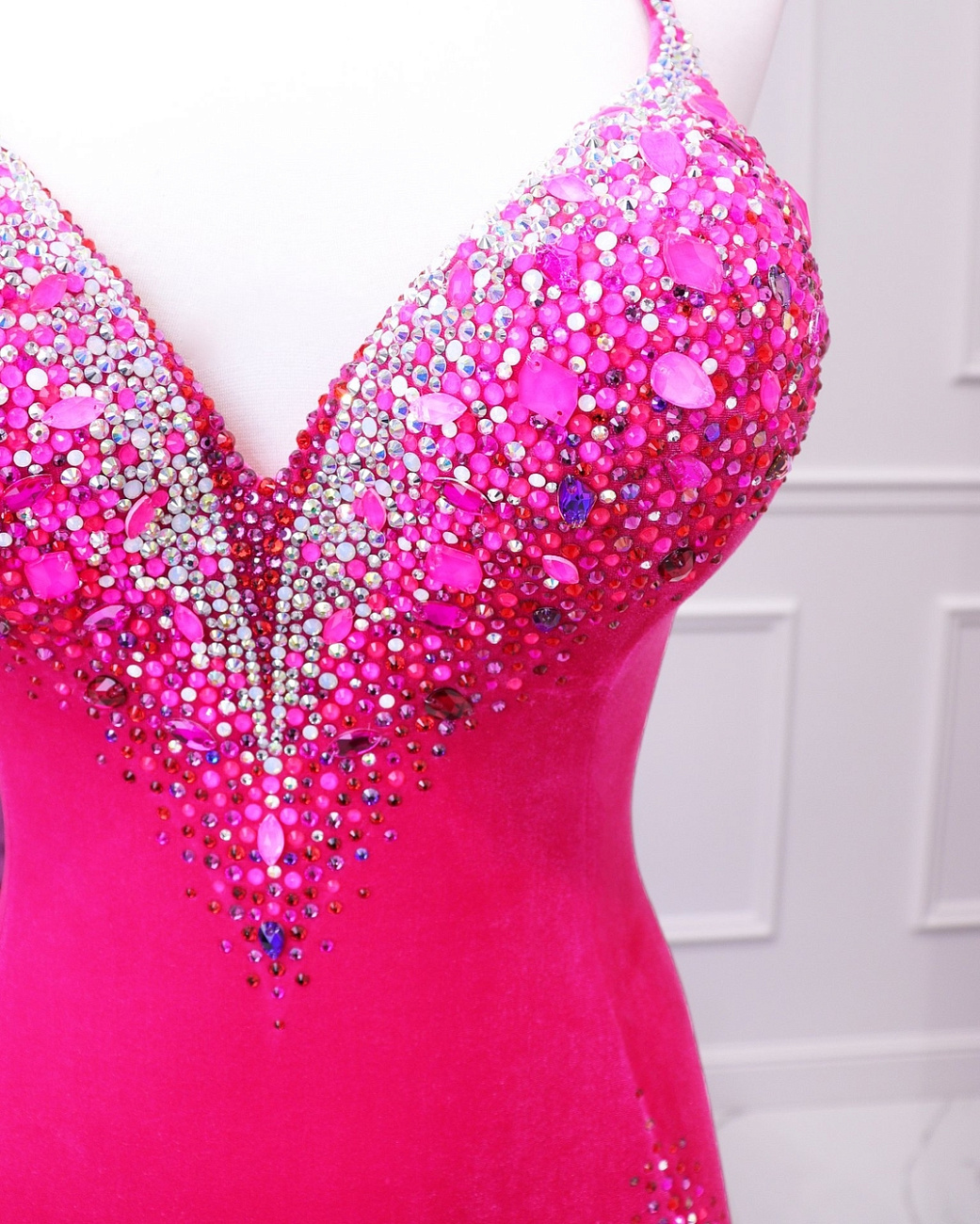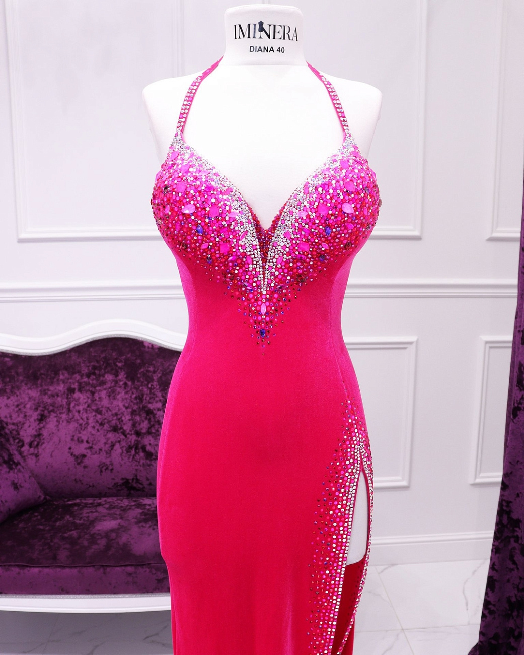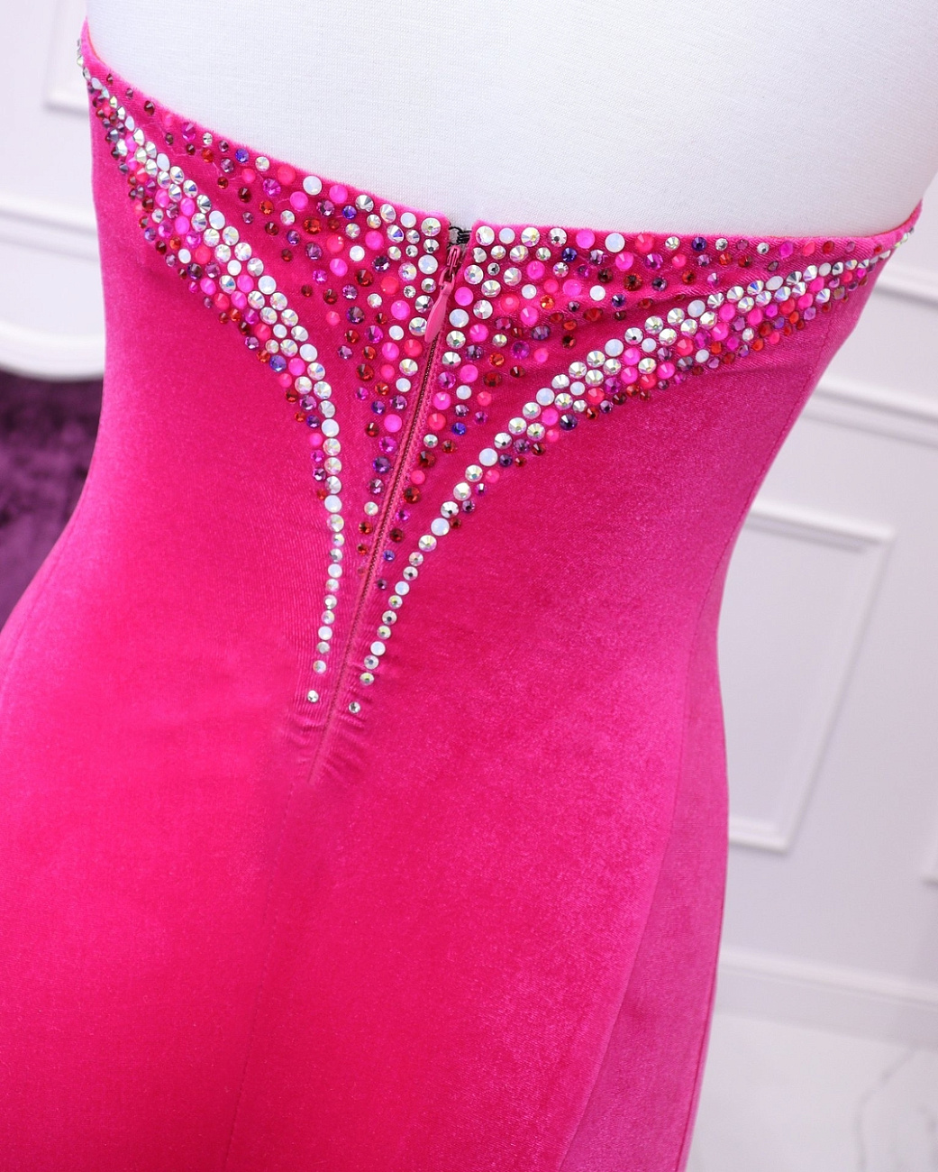 We sew the base using proven stretch fabrics — Italian velvet and approve the fit with you. Then the decoration begins: we use only reliable crystal-setting methods, hand-sewing large stones.
