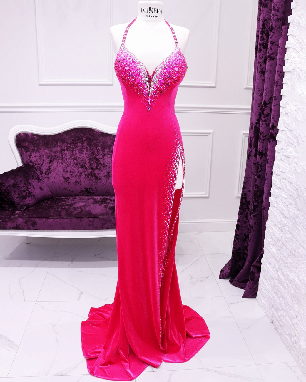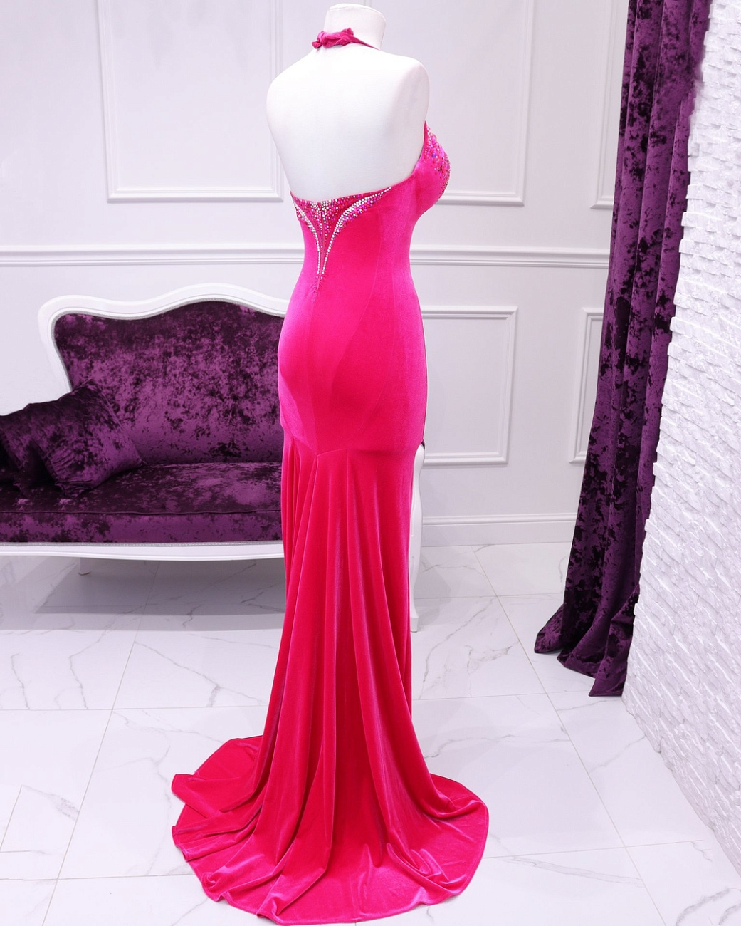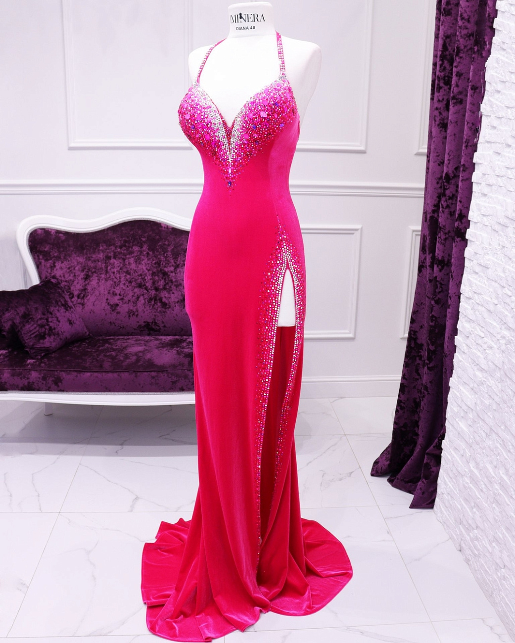 We sew the base using proven stretch fabrics — Italian velvet and approve the fit with you. Then the decoration begins: we use only reliable crystal-setting methods, hand-sewing large stones.